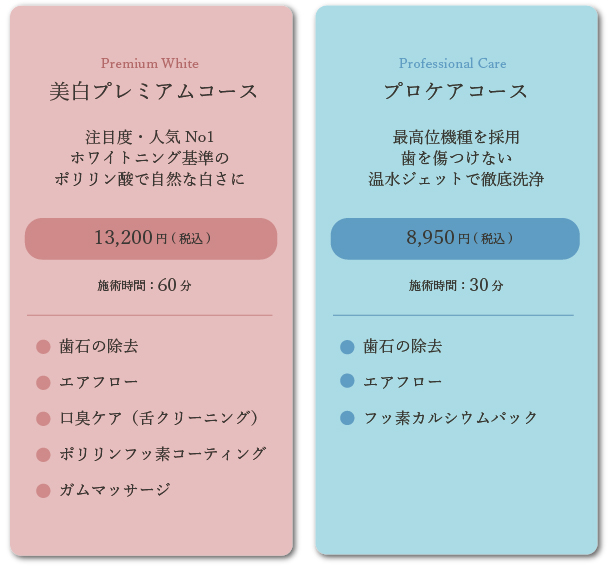 注意点 | ・汚れを落とすことで歯が白くなりますが、歯本来の色味は変わりません。 ・歯周病や歯肉炎など口内のトラブルがある場合は処置の際にしみや痛みを感じたりする場合があります。 |